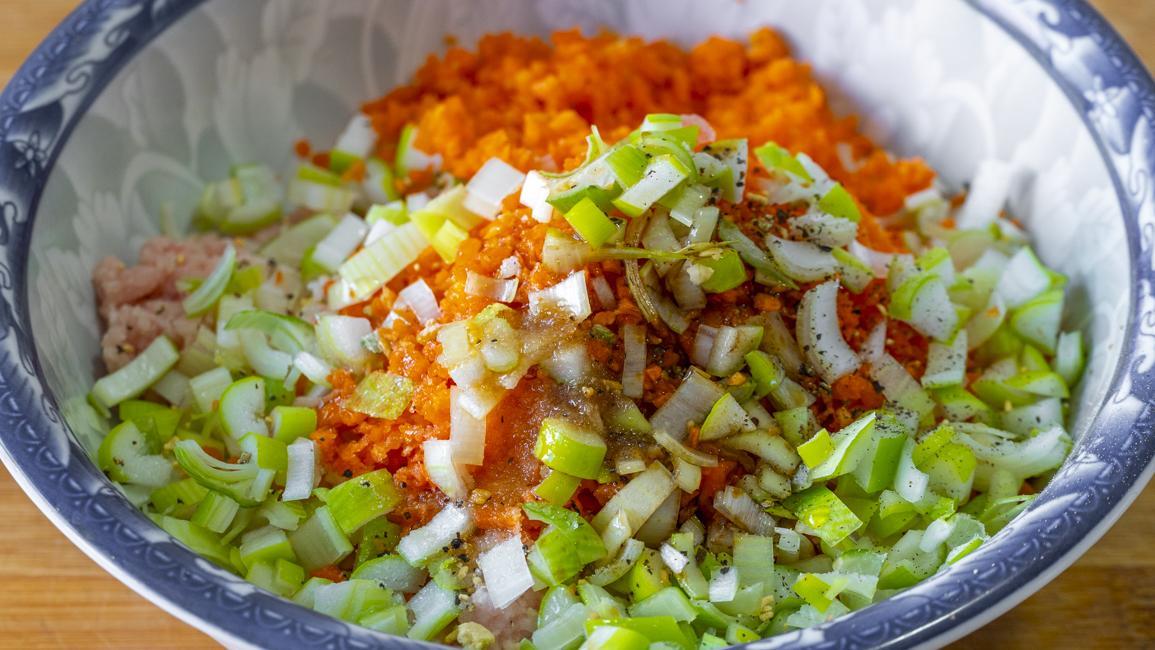 3、胡蘿蔔、馬蹄和肉餡兒倒在一起,再來一把蔥花,調味兒,鹽、糖、胡椒粉、雞精、生抽、香油,拌勻後先放一旁備用。