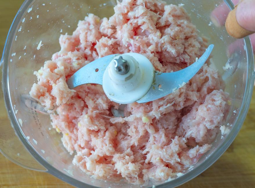 1、半斤豬肉洗淨切小塊兒,倒入絞肉機里加小塊兒生薑一起絞成肉末。
