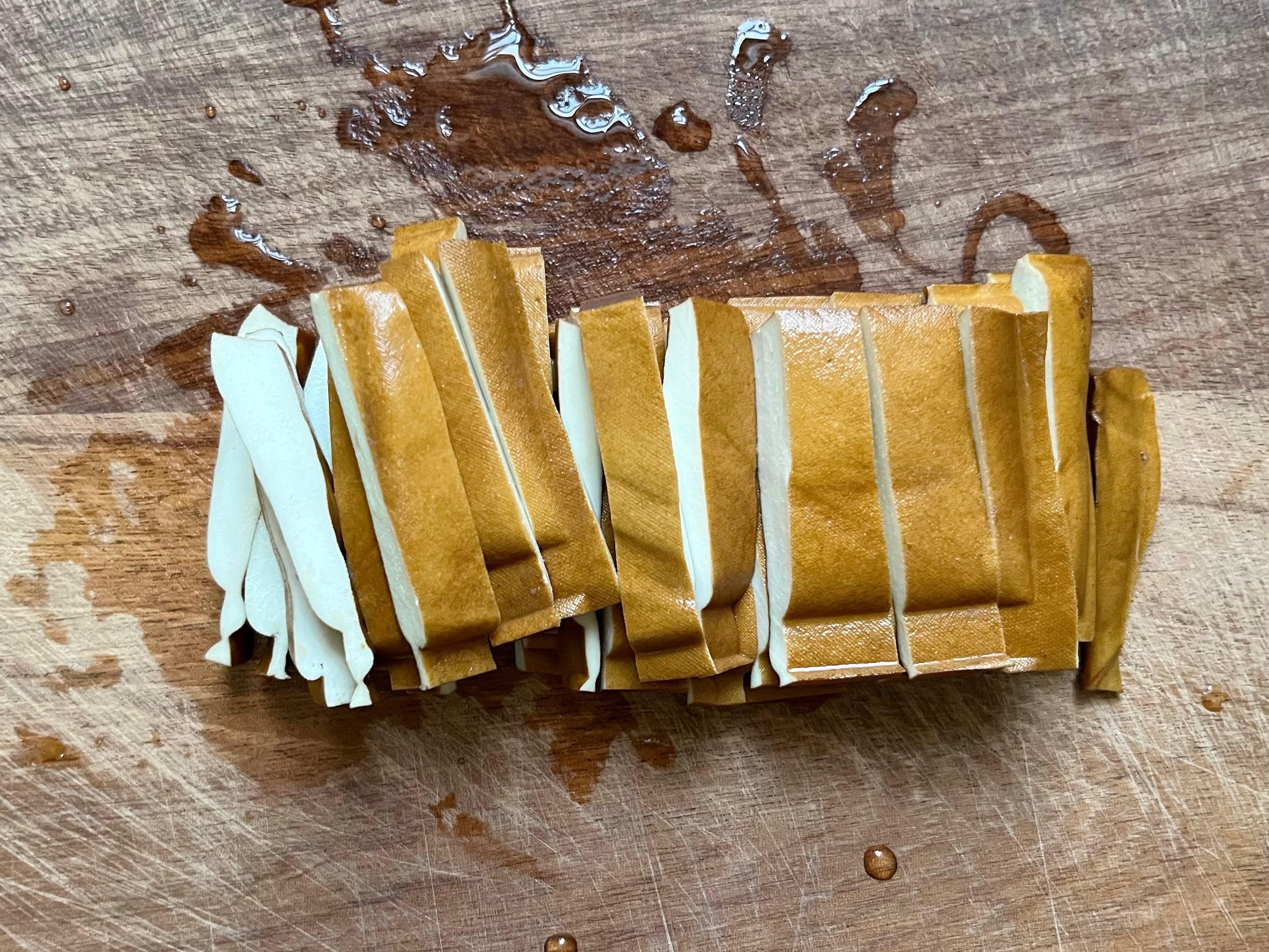 2、香乾也清洗乾淨,切成均勻的條狀;