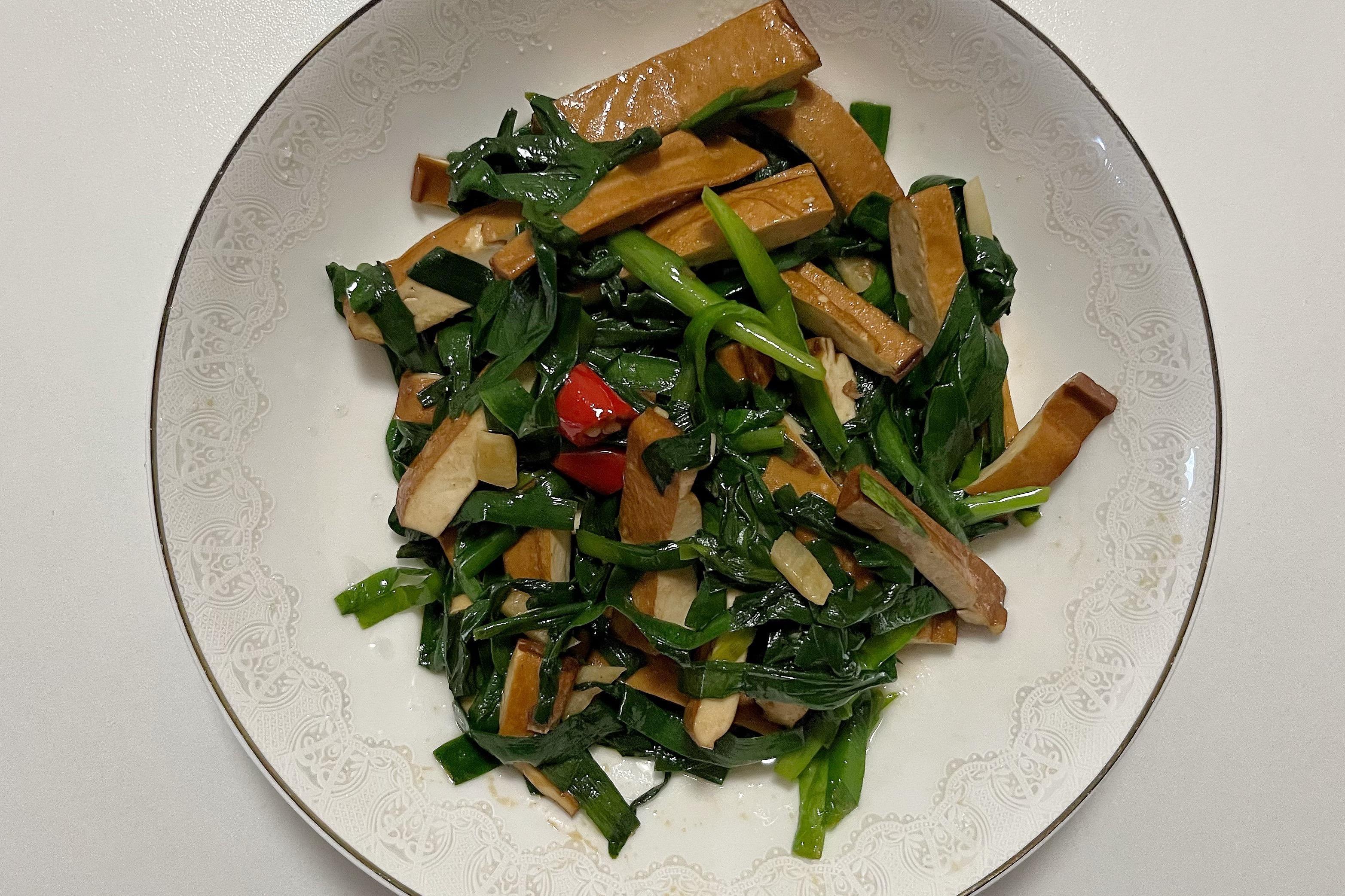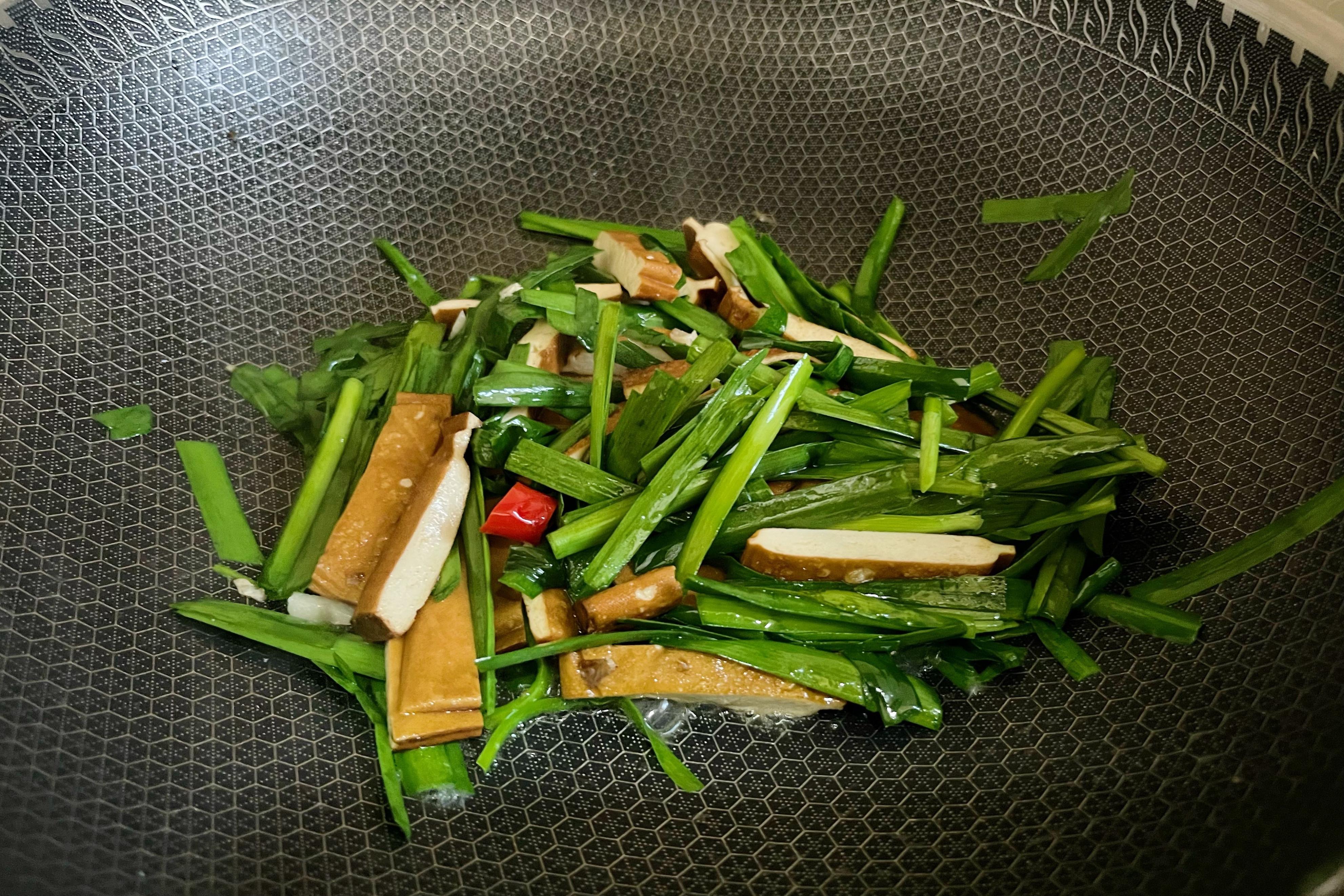 4、翻炒3分鐘後,加入韭菜,繼續翻炒2分鐘,至韭菜變熟軟;