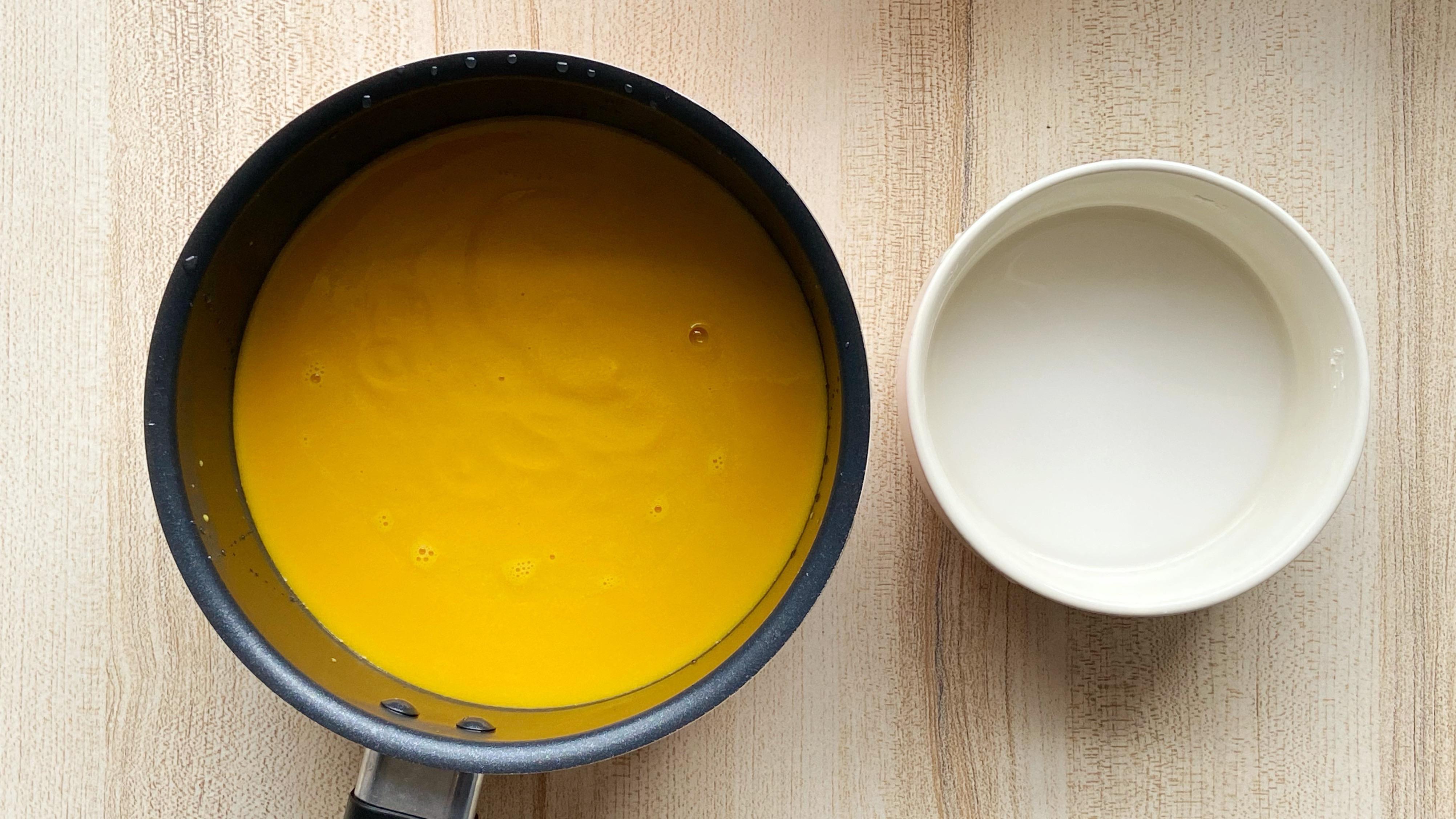 3、將南瓜漿倒入湯鍋中,加1勺糯米粉漿,小火不斷加熱攪拌;