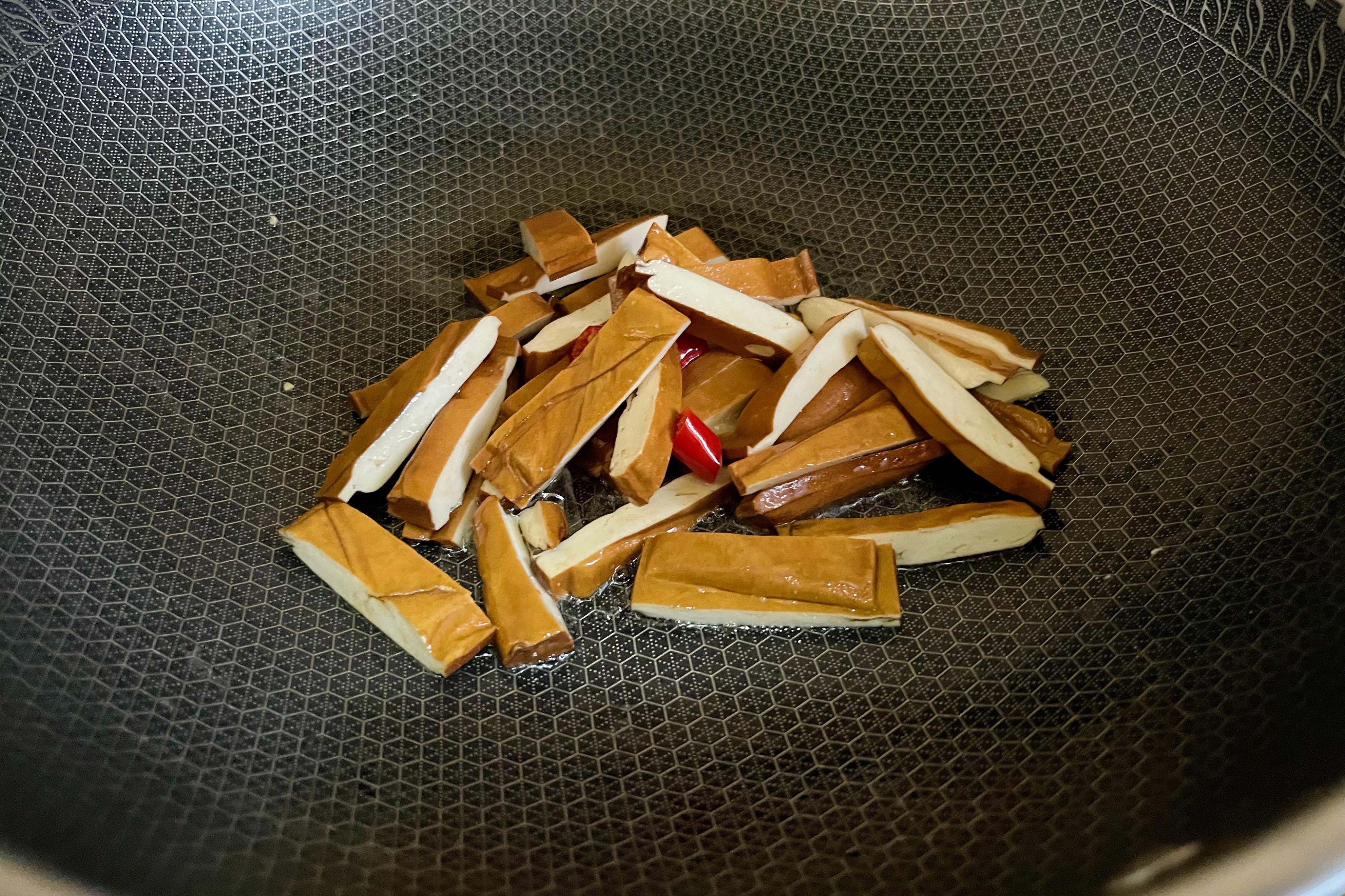 3、鍋中加油,下些蒜末、小米辣炒香,再加入香乾;