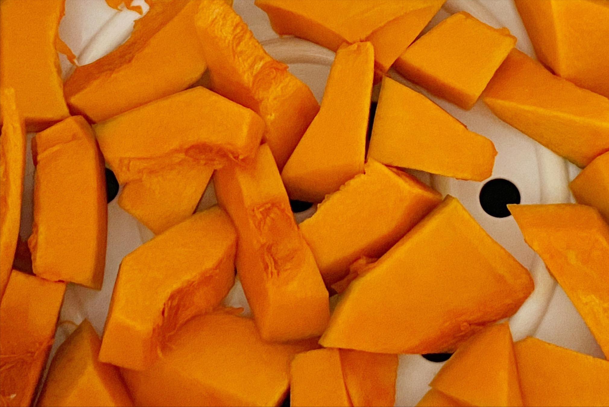 1、南瓜去皮洗淨,切成塊狀,上蒸鍋隔水蒸20分鐘;