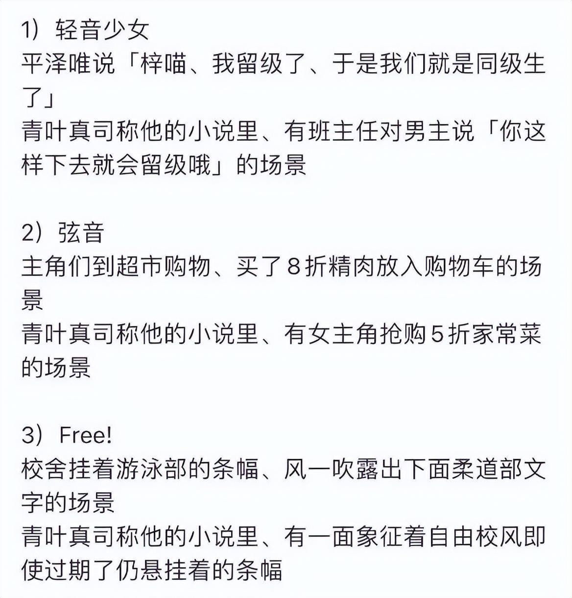其次,《輕音少女》和《Free!》分別誕生於2011年和2013年,這兩部動畫均在青葉提交自己的小說前播出。而《絃音》中的場景,則是他在一本從未公開過的小說中提到的。可見,從始至終京都動畫“抄襲”一說都立不住腳。