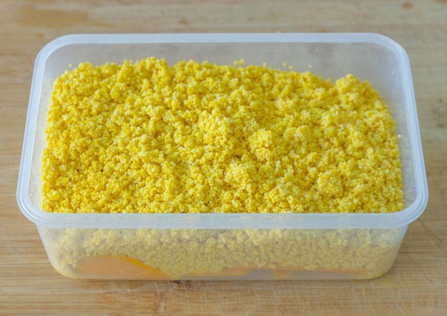 8、準備一個長方形的容器,把拌勻的小米先舀一半進來鋪平整,再把糯米餅放進來壓緊實,剩餘的小米也舀進來繼續按壓平整,然後放一邊自然晾涼。