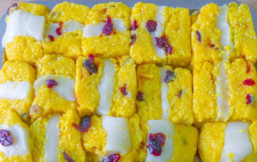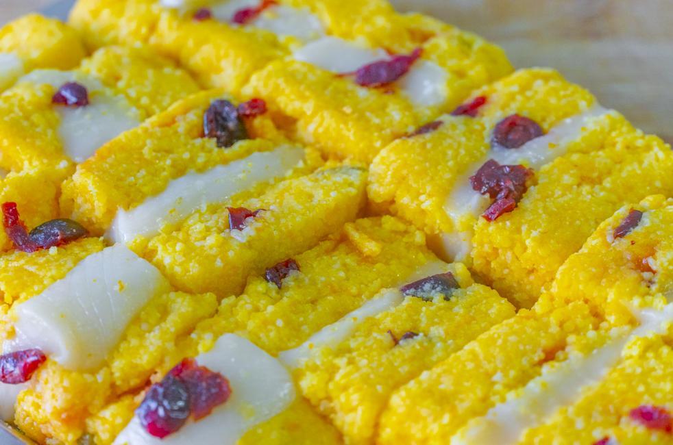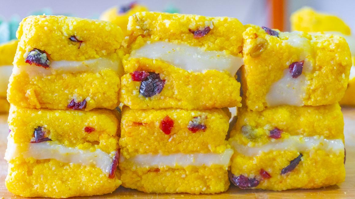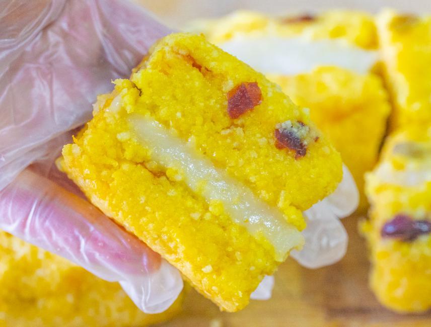 9、完全涼透後倒扣脫模切小塊兒,小米糕就做好了。
