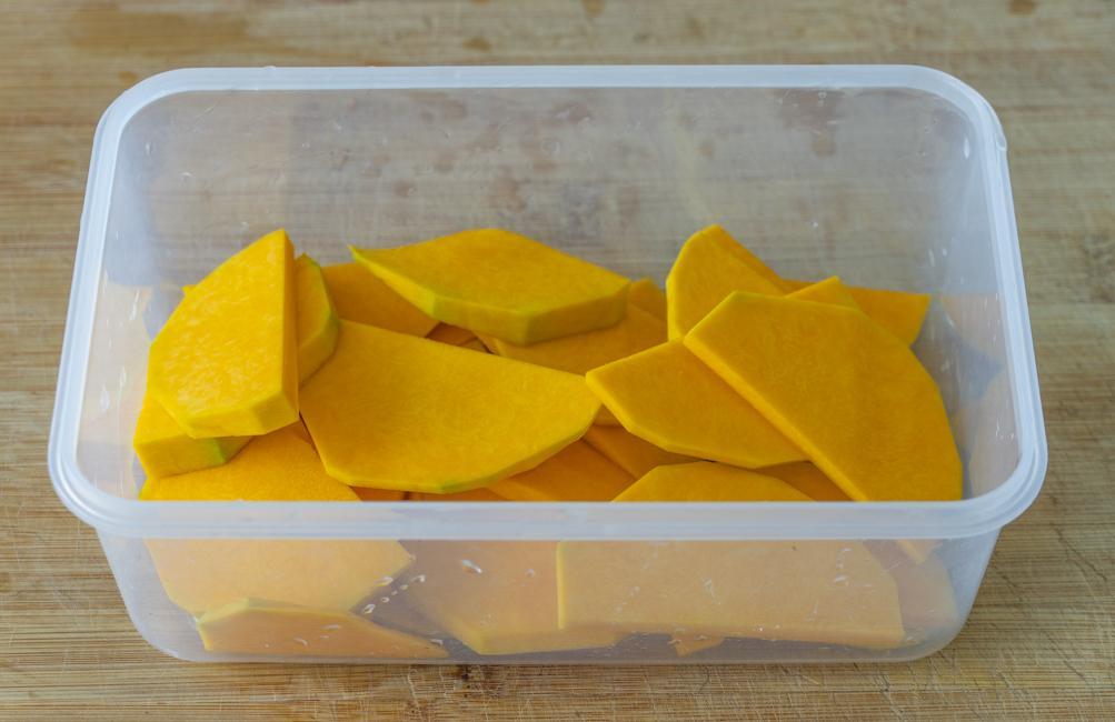 2、一小塊兒南瓜去皮後切小塊兒。