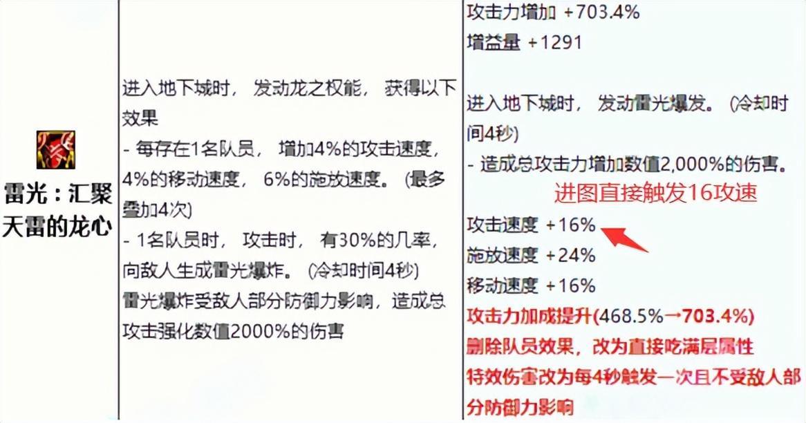 【核心改動點】攻擊強化略微提升,以及最重要的,進圖直接觸發16%攻速/移速、以及24%釋放速度!
