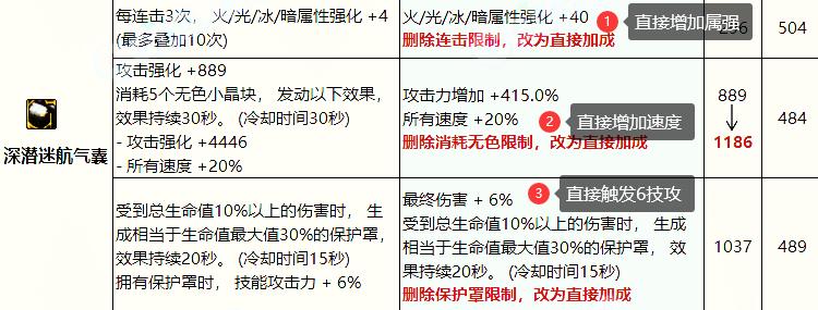 【核心改動點】一是不需要連擊觸發40屬強,二是不需要消耗無色觸發20%速度,三是不需要護盾即可觸發6技攻。