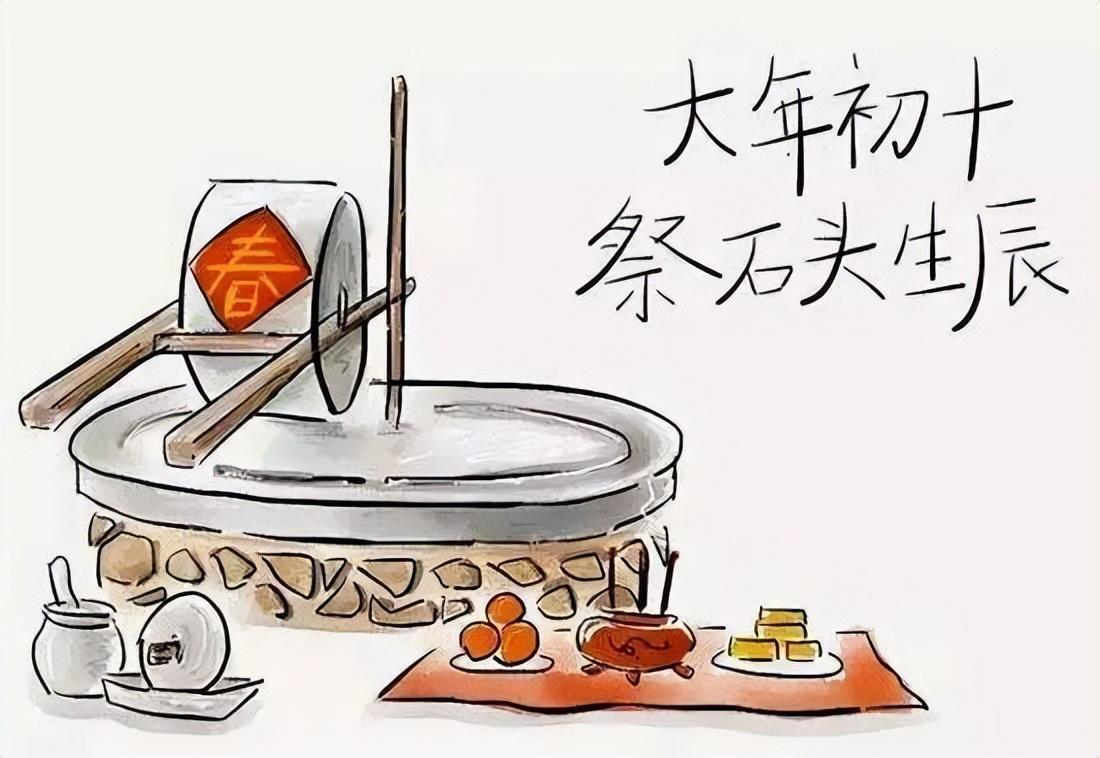 大年初十是地日,並由此延伸出了一個小節日,叫“石頭節”。舊俗中認爲,這一天還是石頭神的生日,應該焚香祭拜石頭神,希望新的一年家中能有好收成,財運亨通。古代的家中,一般都會有石磨、石臼等石頭做的石器,到了大年初十,人們會反覆叮囑家中的人,不能碰石器,以免冒犯石頭神,惹來是非。這個習俗的名稱也叫“石不動”或“石不碰”。不過,到了現在,石器因爲過於笨重的原因,已經逐漸退出了人們的生活,這個傳統忌諱做個簡單的瞭解即可。