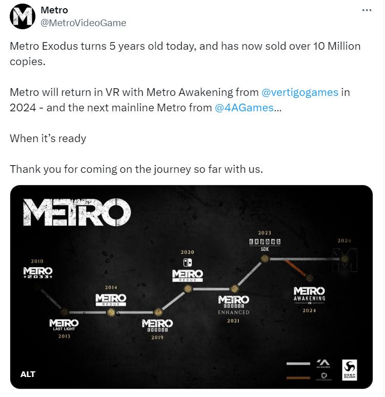 配圖中官方還回顧了過去十四年裏該系列走過的點滴,並提示玩家今年將推出VR版本的《Metro Awakening》,另外還通過圖文暗示未來將宣佈《地鐵》的正統續作。