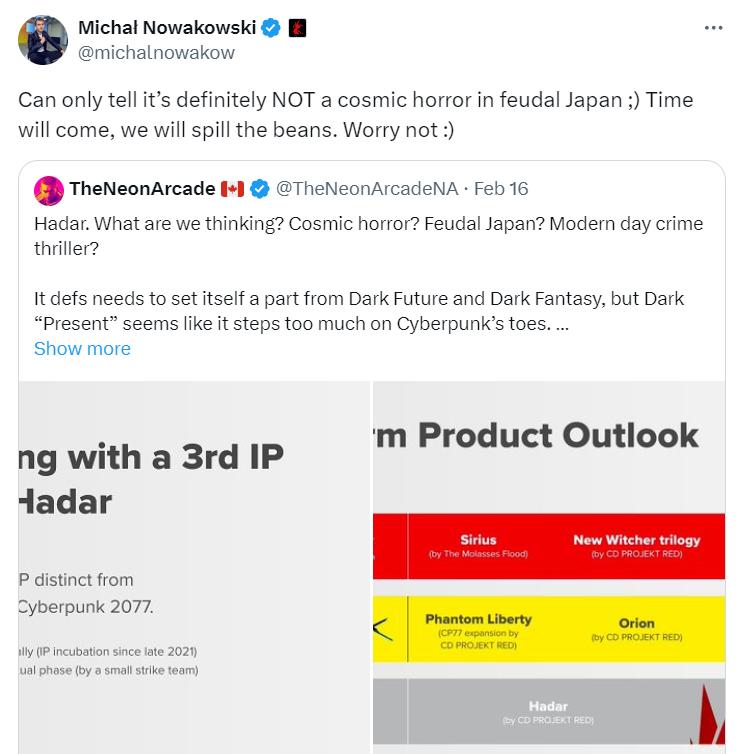 2022年,CDPR曾宣佈了幾個未來即將與玩家見面的開發計劃,除了《巫師》與《賽博朋克2077》IP的延伸外,還有一款目前被稱爲《Hadar》的新IP。該項目於2021年開始推進,目前CDPR尚未透露出一點消息,外界對本作的題材衆說紛紜,一些玩家猜測這將是一個古代日本背景的恐怖遊戲。