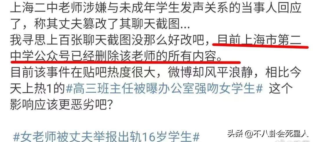 不過,沒過多久,有人稱聊天記錄截圖,被張越丈夫篡改過,其真實性有待考證。但是上百張聊天記錄要修改,並非一件容易的事,目前,上海市第二中學已經刪除該老師的相關內容。