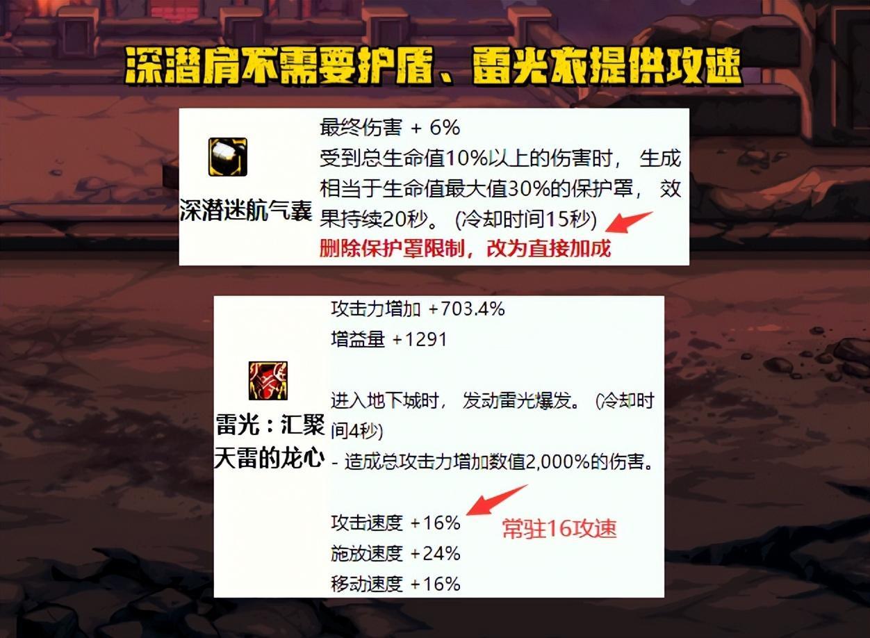 而改版後,深潛護盾6技攻變成了常駐6技攻,不需要護盾了;雷光上衣和深潛手鐲額外增加了攻速,也不再需要速度了。