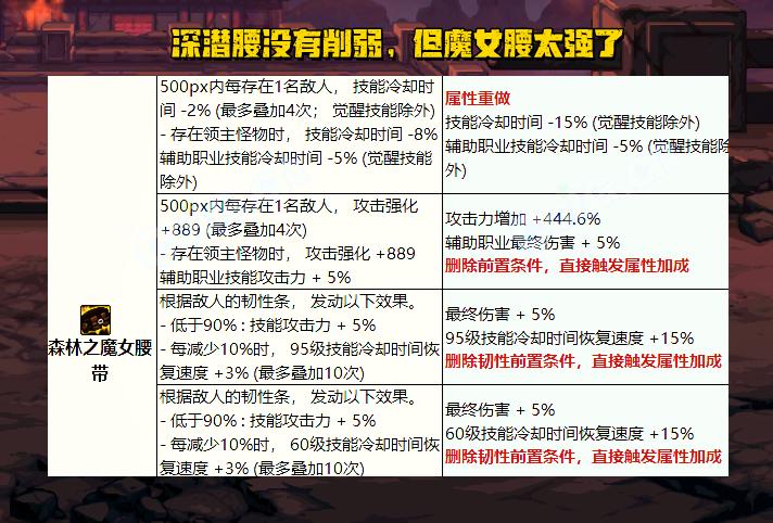 改版後的魔女腰帶,無門檻觸發15%冷卻(原領主冷卻)、無門檻觸發高額增傷(原領主增傷),就連兩個削韌5技攻也不需要削韌了;
