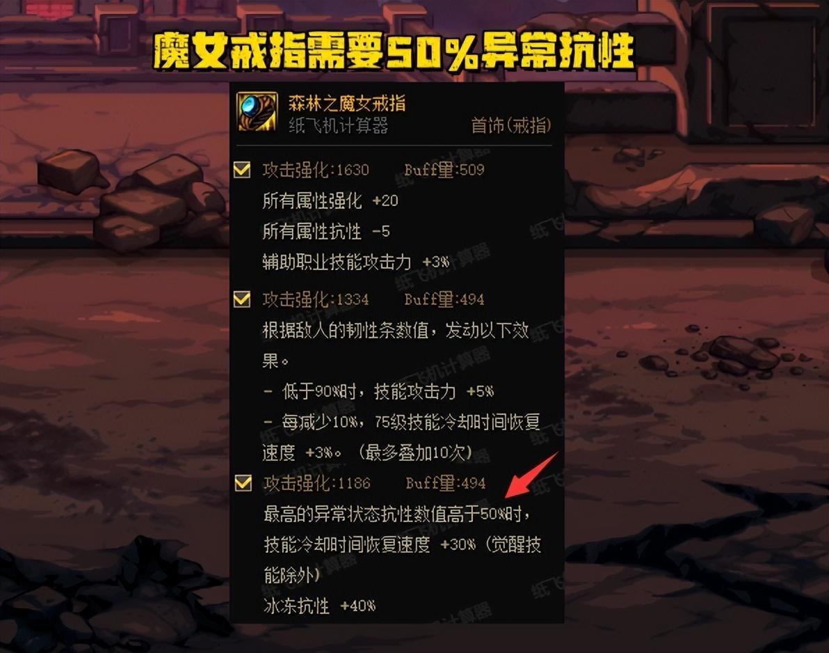 “魔女戒指”有一個增加30%冷卻速度的詞條,需要有50%異常抗性才能觸發。