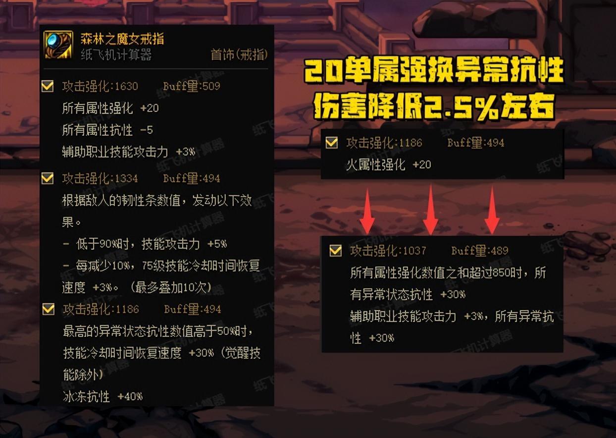 如果你佩戴的是“魔女項鍊”或“海俠項鍊”,那麼比較推薦的方式就是,更換一個異常抗性的詞條,比如把戒指部位的20單屬強換成30%異常抗性,此時,傷害降低在2.5%左右!