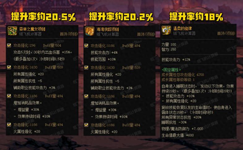 單獨對比這3件項鍊裝備,可以發現“睡眠項鍊”雖然還不錯,但相比於“魔女項鍊”“海俠項鍊”還差略遜一籌的,大概低了2.5%左右傷害!