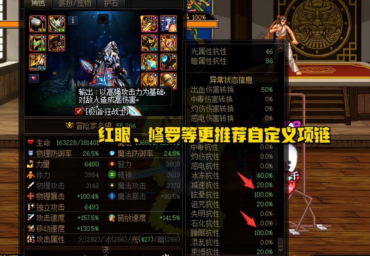當然也有一種情況例外,那就是如“紅眼”“修羅”這種職業,自帶100%異常抗性,不需要換詞條就能觸發魔女戒指,此時自定義項鍊是更有優勢的!