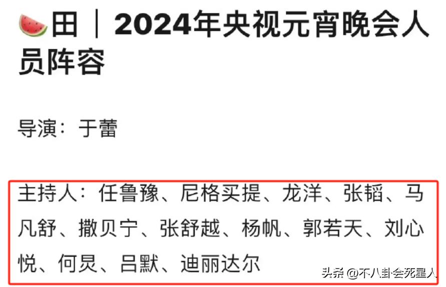 再來看網傳的元宵晚會名單中,主持人陣容和春晚差不多,也是有“鐵三角”任魯豫,尼格買提和撒貝寧。