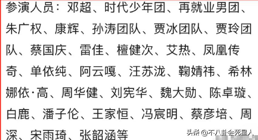 再來看嘉賓名單,除了鄧超,賈玲團隊,康輝,周華健,蔡國慶,鳳凰傳奇等。