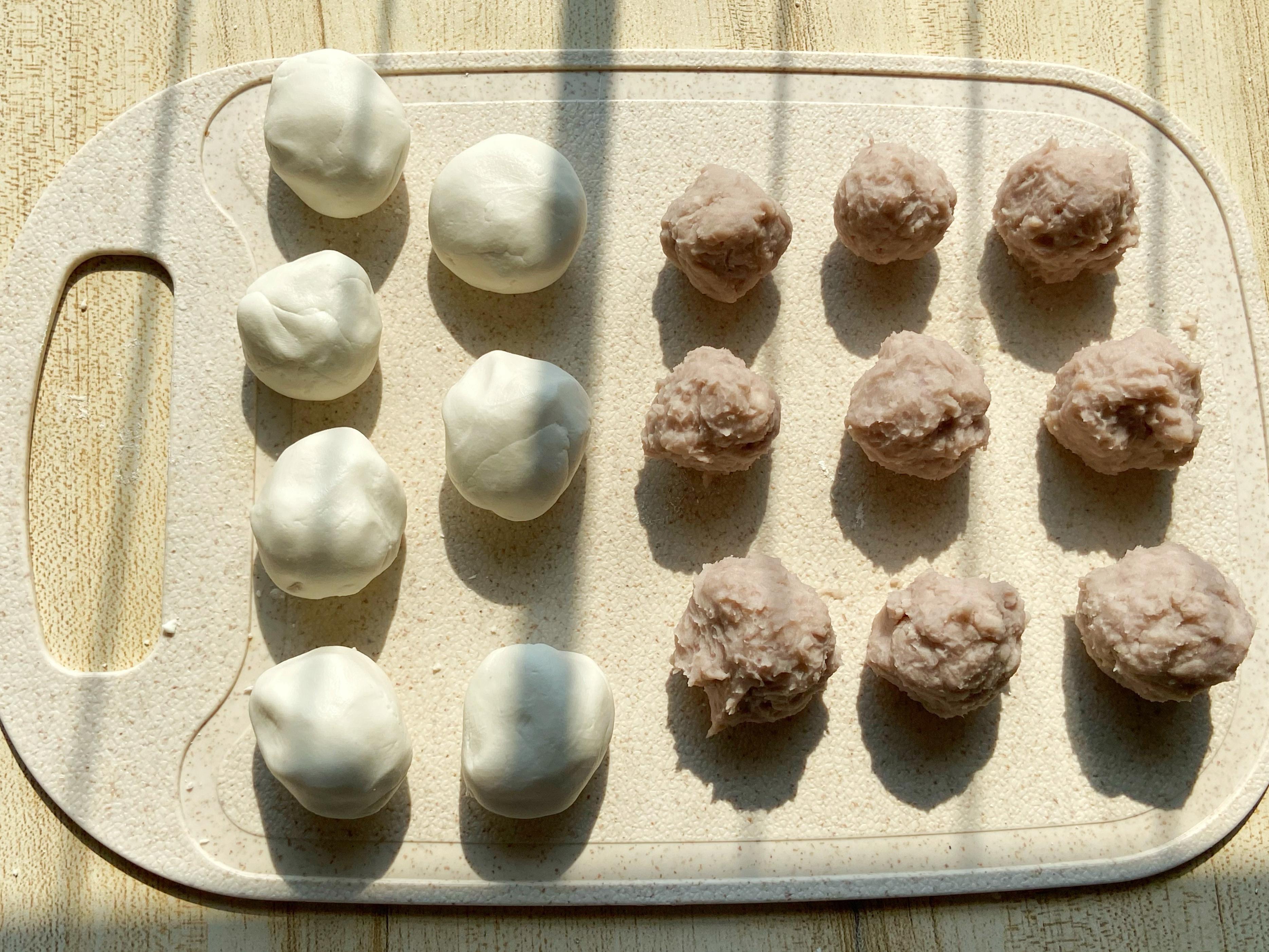 4、將麪糰分成大小差不多的劑子,放在手心中壓扁,中間放入芋泥球,再包裹起來,搓圓,湯圓就做好了,下鍋煮熟,即可盛碗享用。