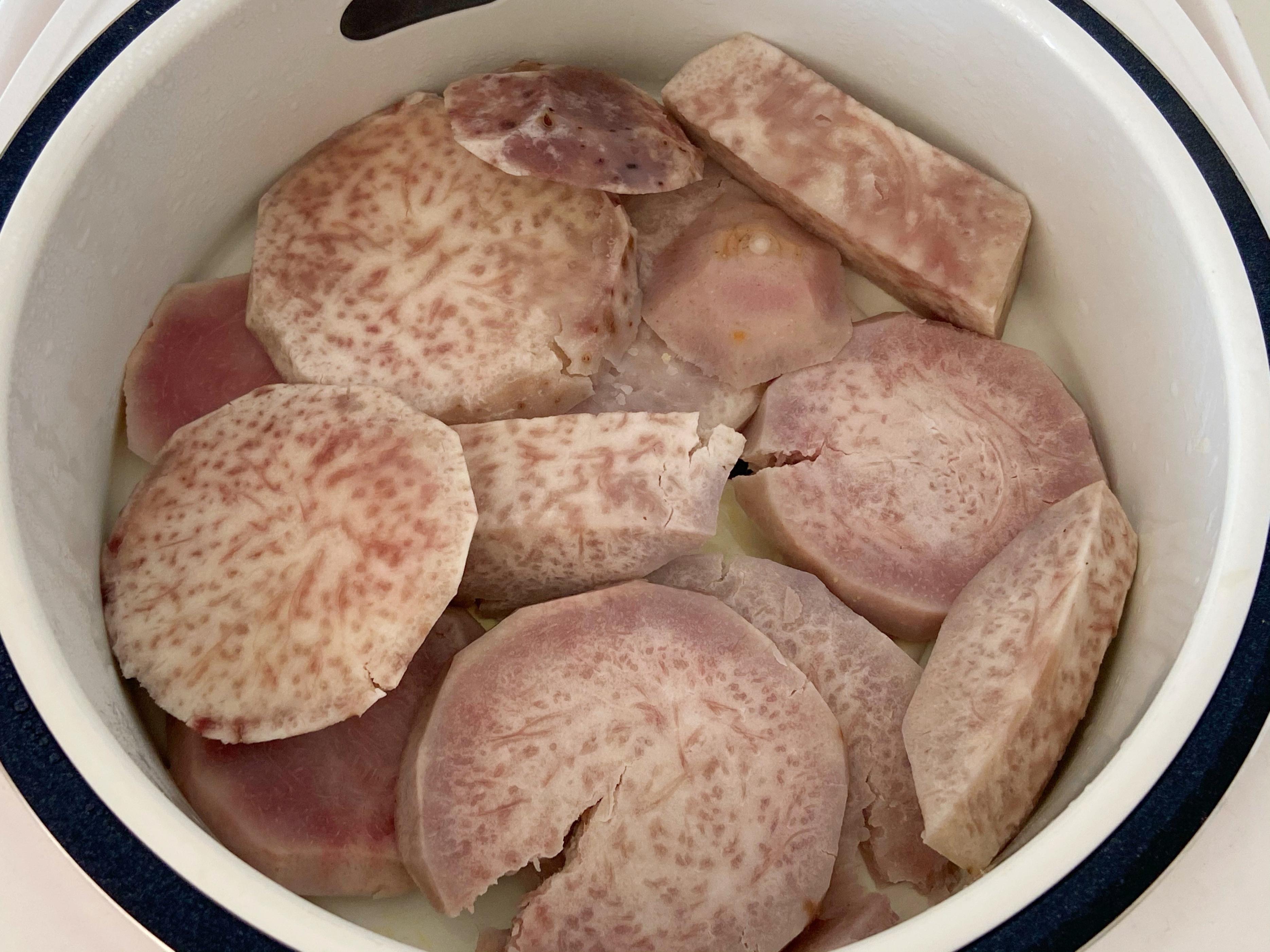 1、芋頭去皮,切成薄片,入蒸鍋中蒸20分鐘,蒸至熟軟後,關火取出;