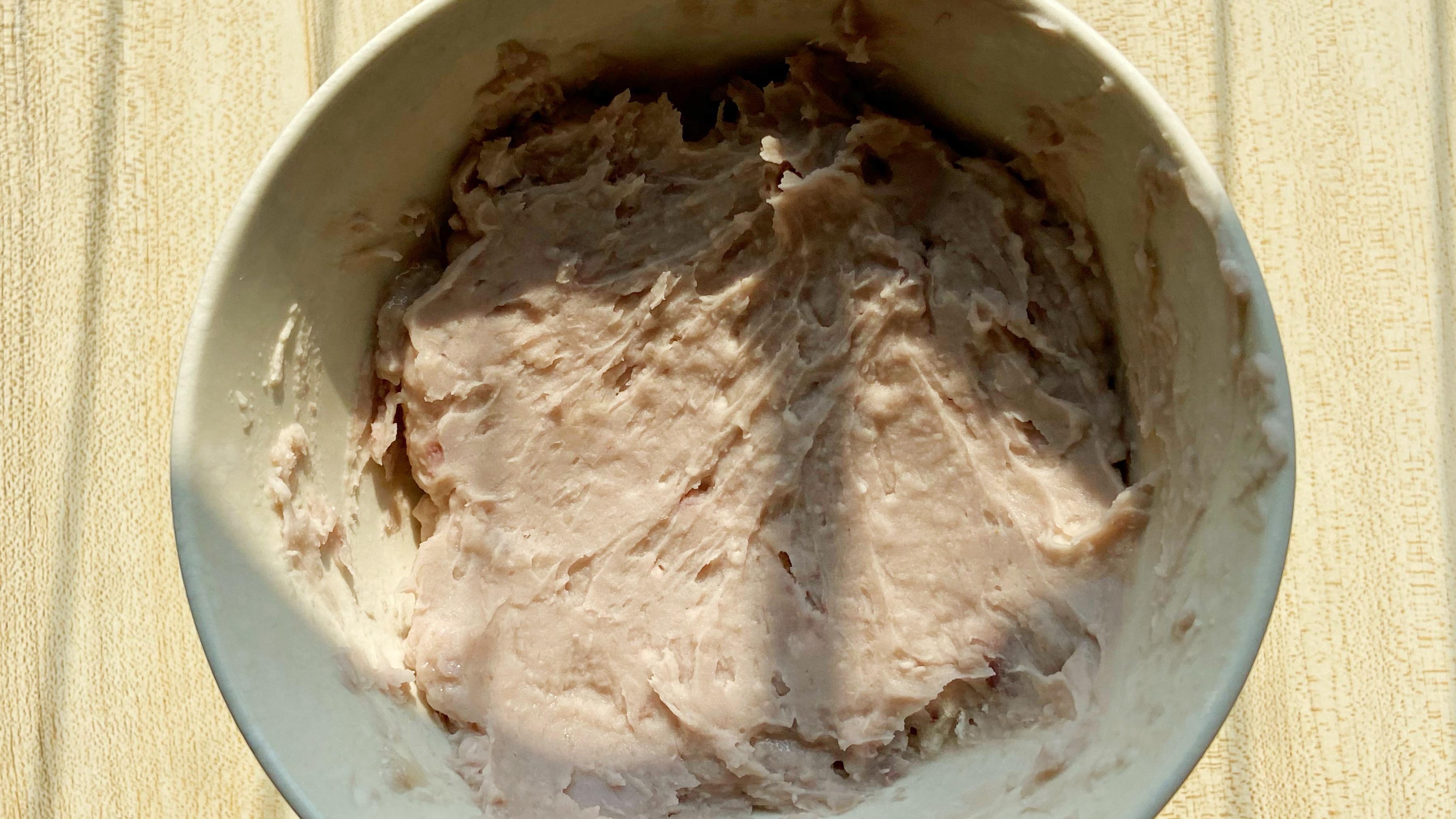 2、往芋頭中加些牛奶、煉乳,用勺子壓成泥,再揉成一個個小球狀;
