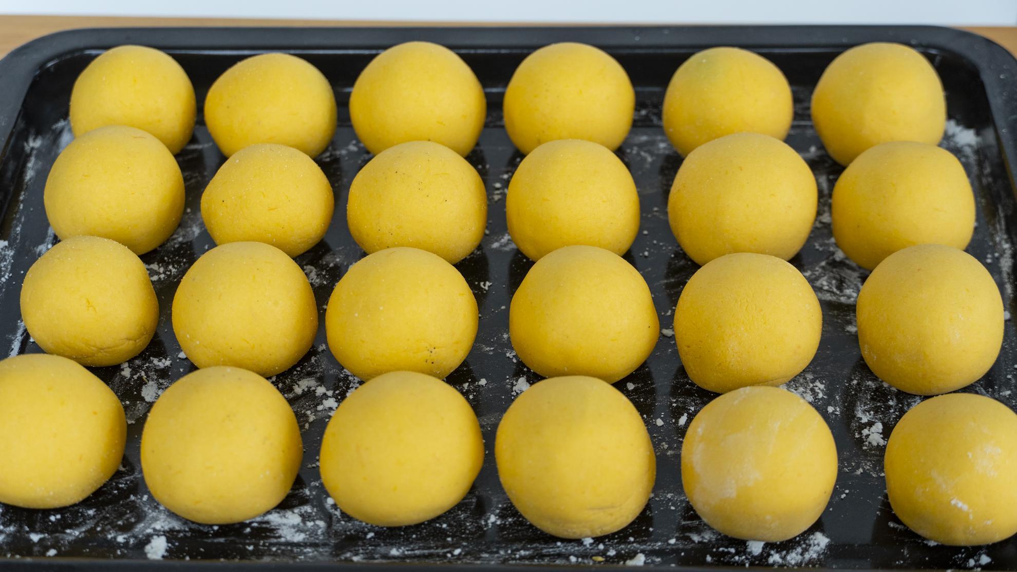 5、一個黃燦燦的湯圓就完成了,裝湯圓的盤子提前撒點玉米澱粉,這樣湯圓放進來就不會粘到一起了,全部做好後把盤子端起來滾一哈,然後放冰箱冷凍保存。