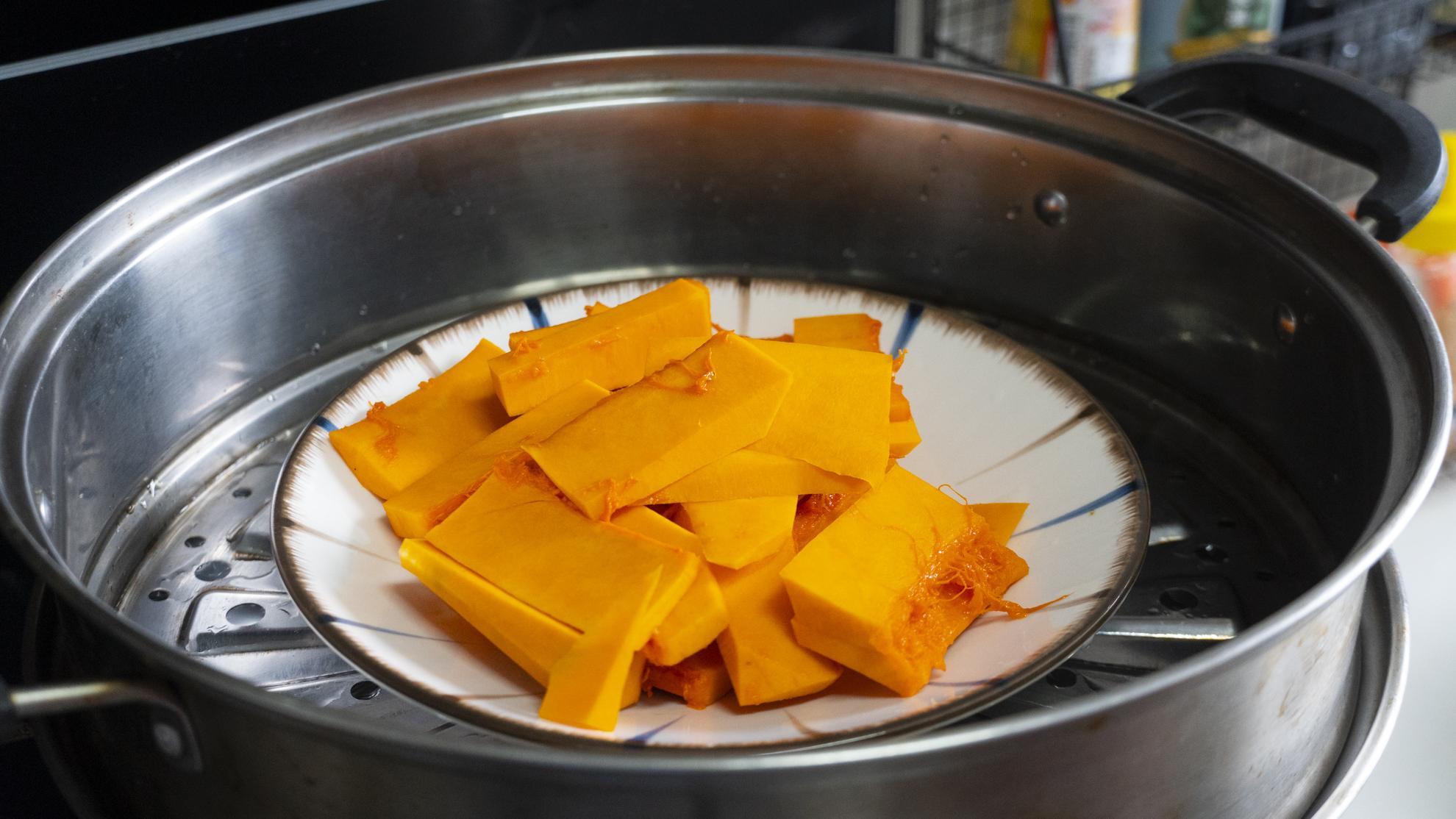 1、餡兒調好了我們就可以來做皮兒了,南瓜200克切片後上鍋。