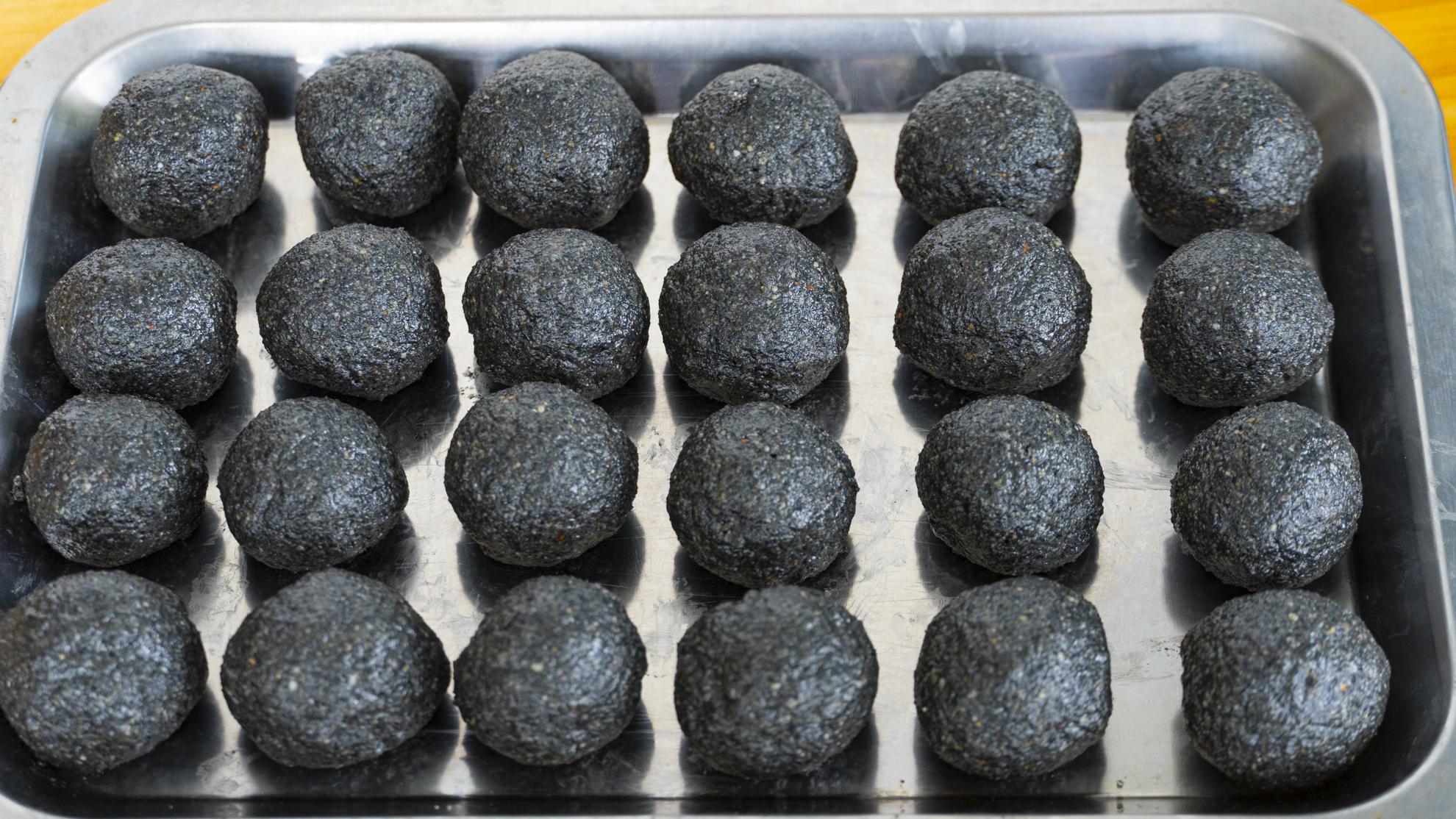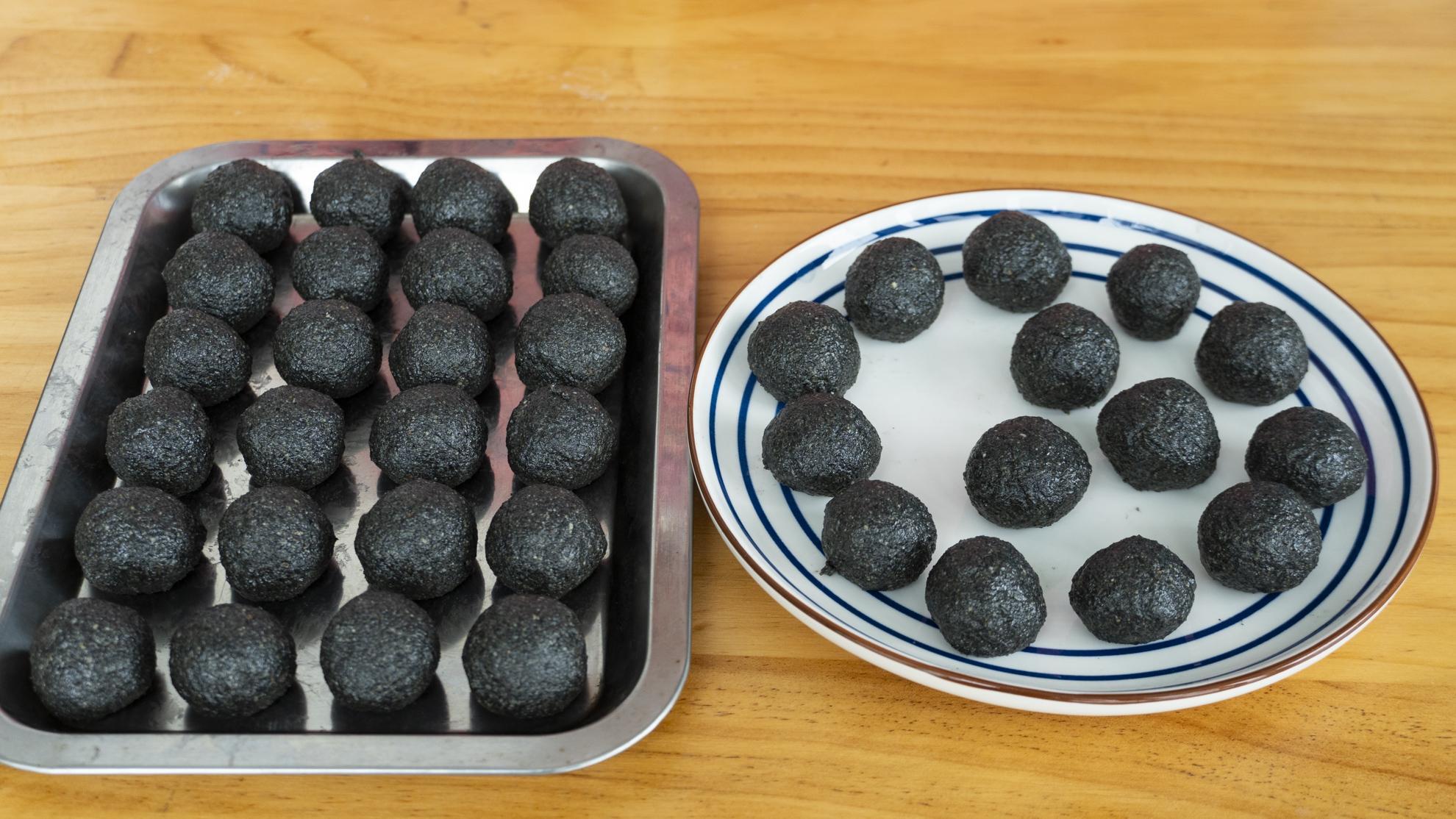 5、先拌勻,像這樣可以來分餡兒了,用勺子舀一勺搓圓,一個黑芝麻花生餡兒就分好了,這個就是甜口的。