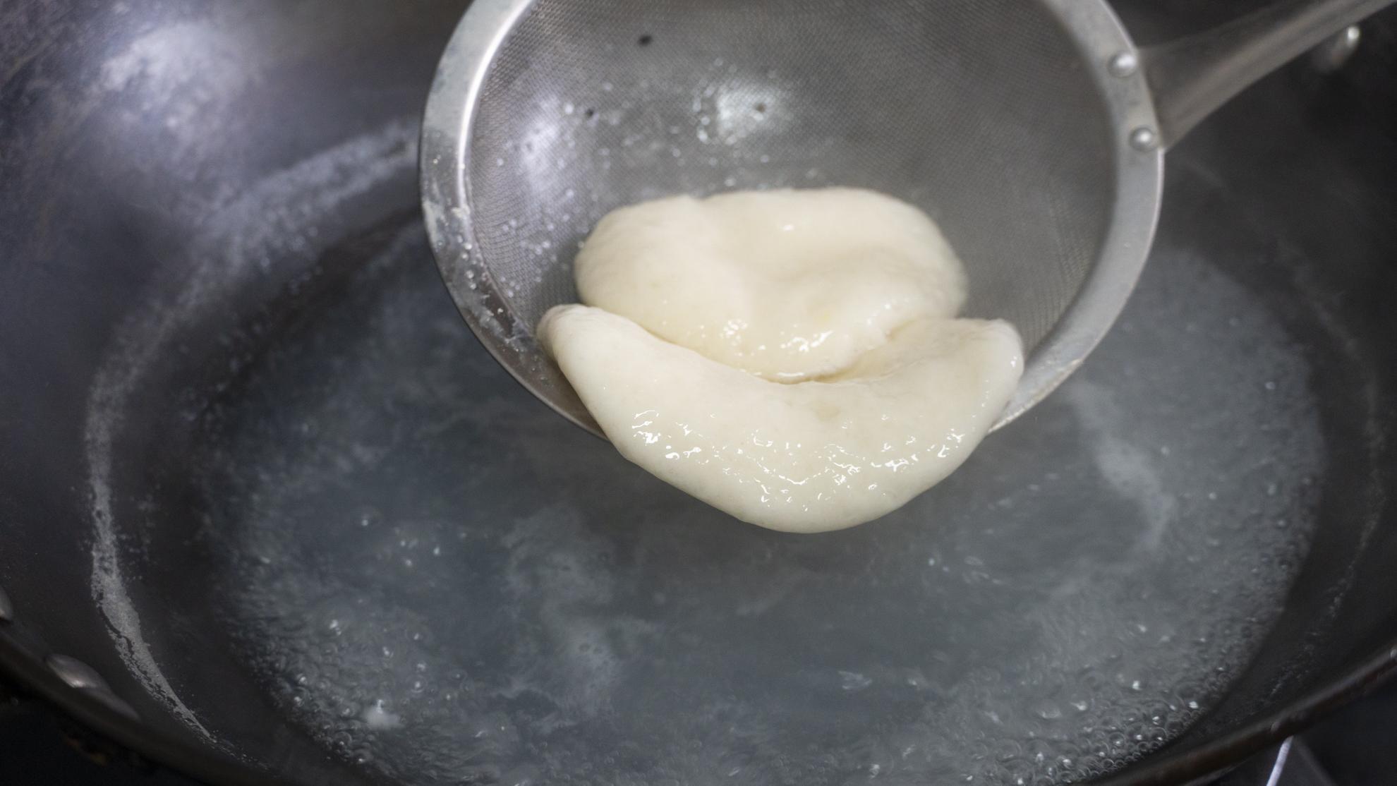 2、基本的揉成麪糰兒後揪一小塊下來,壓扁後放入鍋中煮熟,煮到飄起來就過一下涼水降溫。