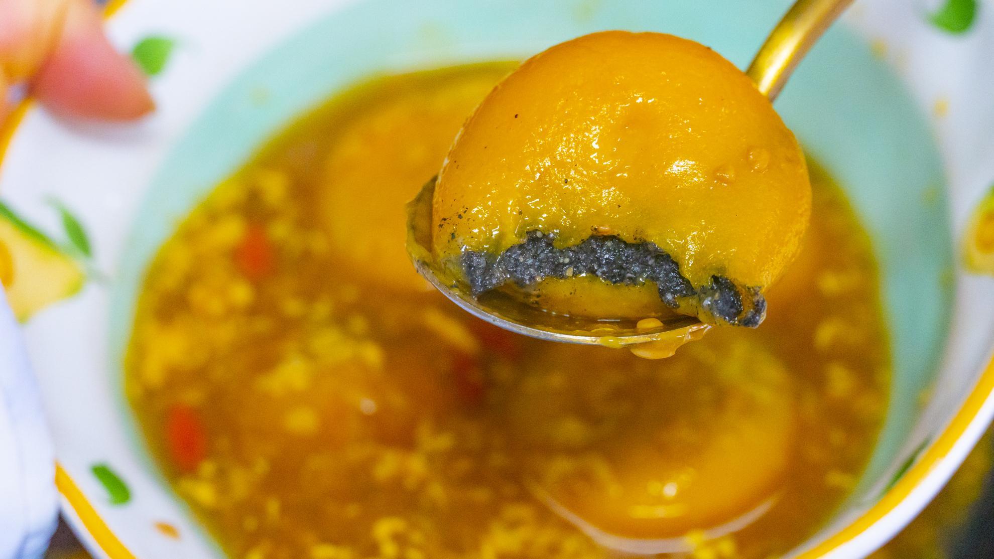 另一款是甜口的,經典黑芝麻餡,家人比較愛喫,搭配南瓜、米酒和雞蛋,既能喫,還能喝湯,非常的營養。