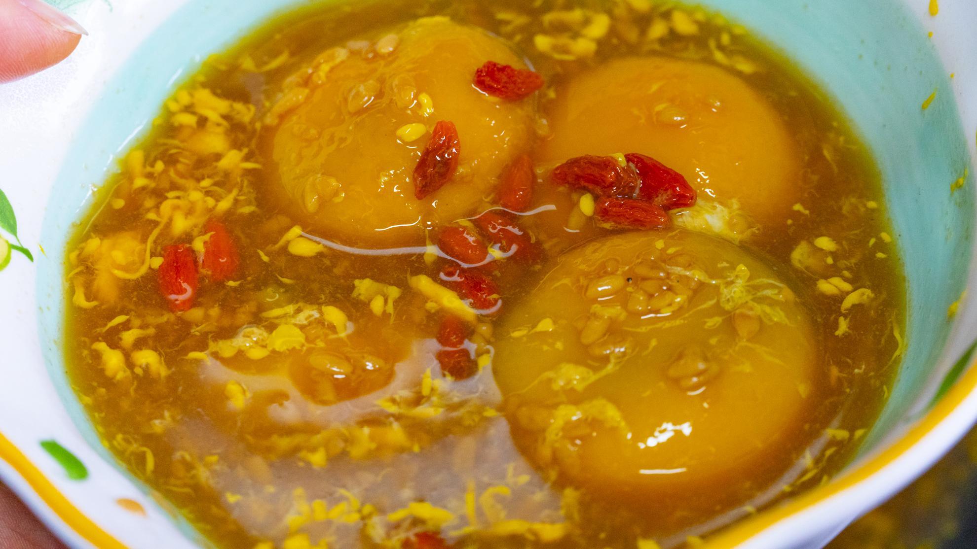 2、甜口的我們這邊都是和米酒紅糖一起煮的,湯圓飄起來後再淋入一個蛋液,撒上一把枸杞子。