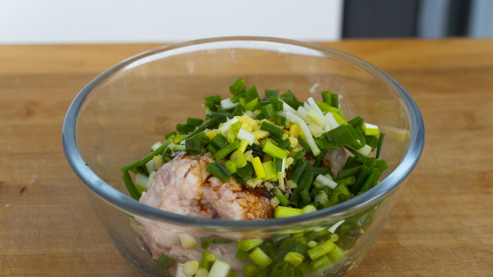 2、剁成肉餡兒,嫌麻煩的就用機器打,裝到碗裏了來調味,鹽、糖、雞精、料酒、生抽、蠔油、胡椒粉、再來點薑末、蔥花、熱油。