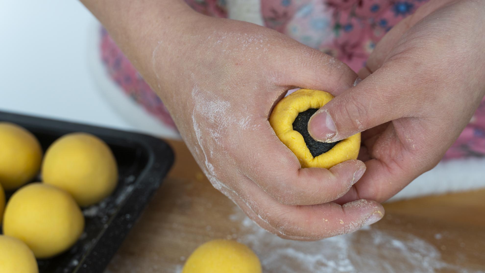 4、麪糰兒取出來搓長條後分小劑子,再用手指轉動的方式按出一個小窩窩,放上凍好的黑芝麻餡兒,用虎口慢慢收攏搓圓。