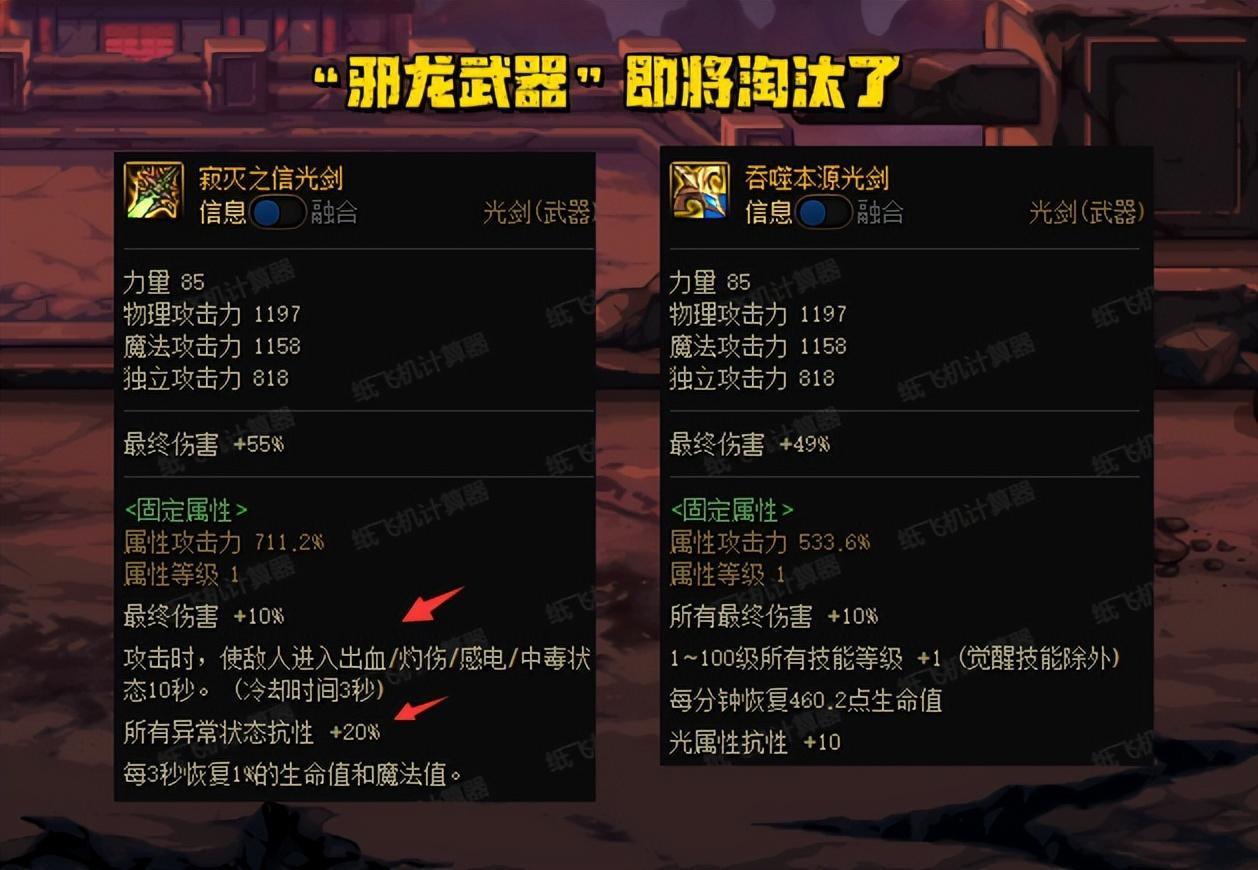 【1】換下“邪龍武器”,用“吞噬武器”或“狂龍武器”替代,此處可提高3.5%左右傷害(換狂龍則爲2.2%左右)。