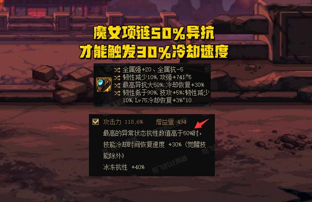 不過由此帶來的問題是,異常抗性不夠了,可能就無法觸發魔女戒指的30%冷卻,不過不用擔心,我們還有第二件裝備。