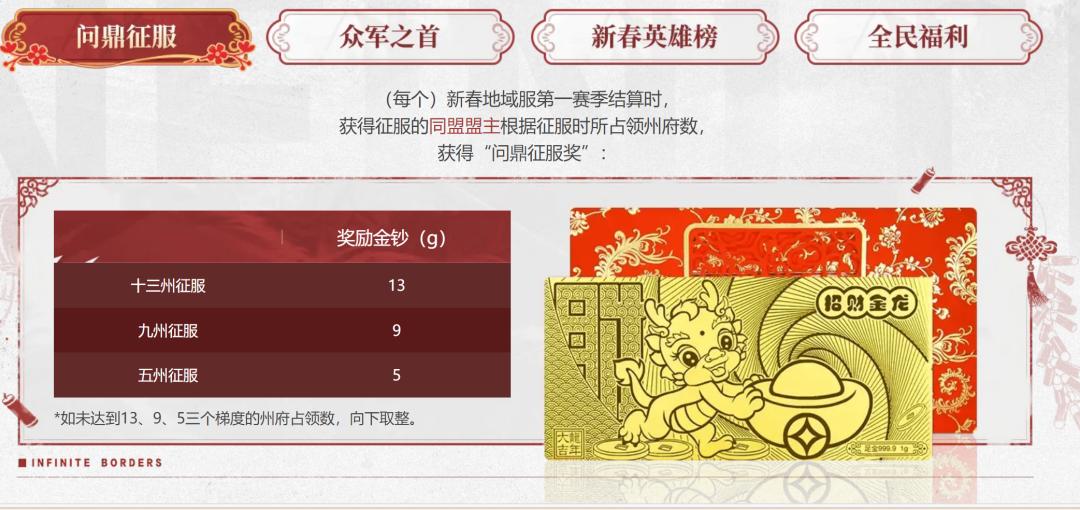 爲了鼓勵、幫助玩家去領略各大地域的獨特文化魅力,新春地域服在遊戲機制層面有許多貼心的設計。例如玩家在遊戲前期就可以自選一位稀有武將助陣,還能獲取資源禮包加快開荒節奏,最終問鼎征服的同盟盟主及表現優秀的玩家更有實打實的金鈔獎勵。