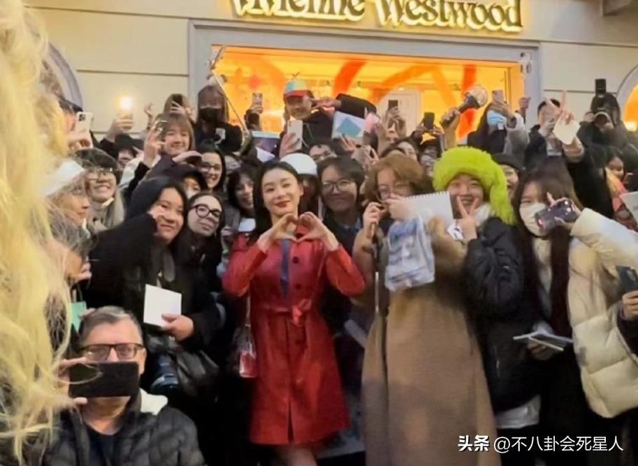 一個是說袁姍姍在米蘭時裝週的人氣很高,在時裝週上她一身紅色衣服,被一大羣人包圍着,看起來確實很受歡迎。