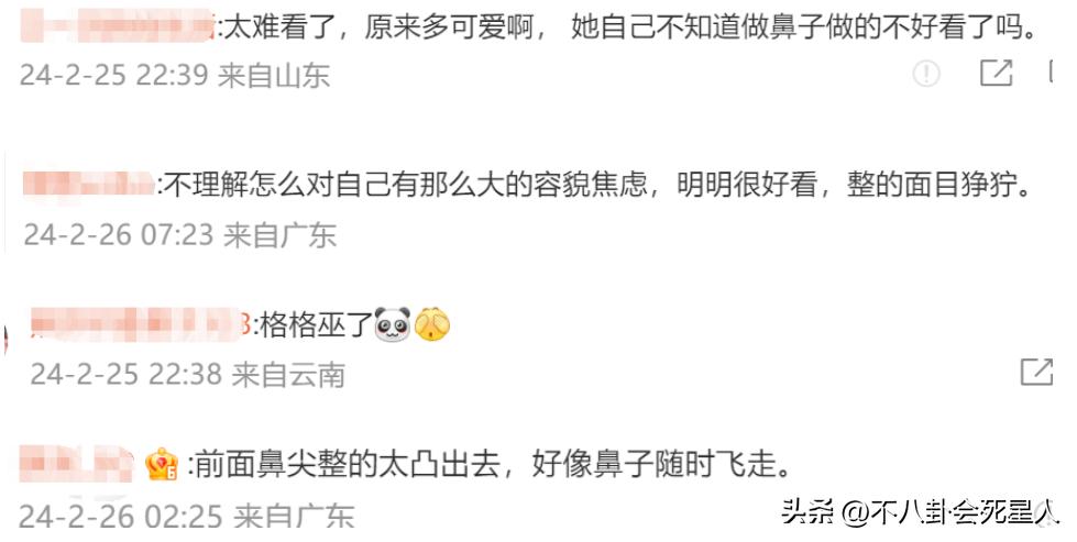 不少網友都覺得袁姍姍原來已經很好看了,不明白她爲什麼還要“動臉”,反而把自己弄得面目猙獰,也有網友吐槽袁姍姍現在的鼻子有點像“格格巫”了。