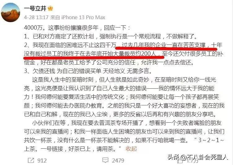 李亞鵬爲了4000萬,愁得焦頭爛額,言語十分卑微。後來,李亞鵬髮長文回應,表示強制執行只是一個常規流程,他會好好還錢,公司現在是在苦苦支撐,十年沒有裁員的他在年底,裁員約200人,他會爲自己的錯誤買單。