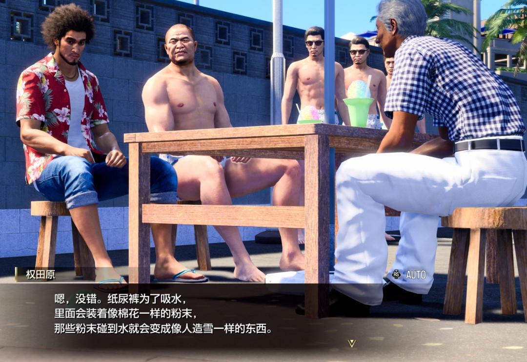 如龍前幾代有一個系列彩蛋任務,是說有歷史悠久的黑道小組叫權田原組,從組長到組員,都癖好奇特,喜歡裸着身體穿着紙尿褲叼着奶嘴Cos嬰兒,從而受到護士小姐姐的照顧,樂此不疲。因爲場面過於辣眼睛,不小心碰到他們的朋友應該是過目不忘的。