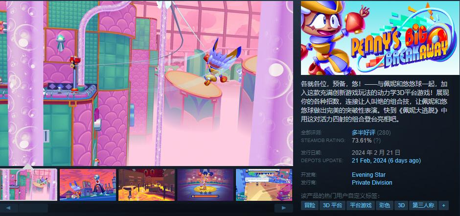 目前,《佩妮大逃脫》在Steam的好評率爲73%,差評多是基於指令衝突和鏡頭調度兩個問題產生,刨除美中不足的兩點,該作稱得上是一個有趣的平臺跳躍遊戲。