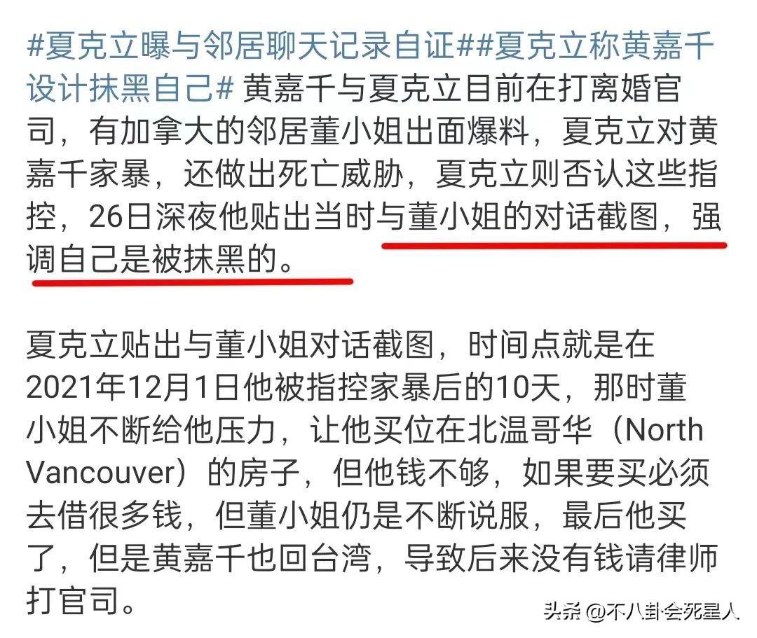 夏克立發文回應,否認家暴小孩的說法,在此之前,夏克立曬出鄰居聊天記錄自證,稱都是黃嘉千故意設計抹黑自己。