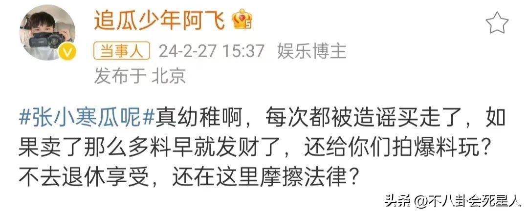 隨後,狗仔追瓜少年阿飛發文,否認了造謠買走,但是沒有爆料這個瓜裏的男頂流是誰,說了等於沒說。希望這些狗仔曝瓜,能直接點名,猜來猜去讓明星躺槍,喫瓜羣衆摸不着頭腦,兩頭招人煩。