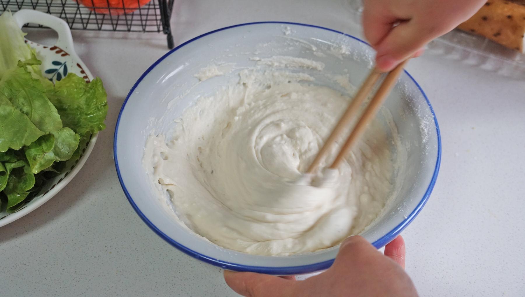 2、攪拌好了醒面10分鐘,然後再加和前面同樣多的水,繼續攪拌拌勻後就可以來攤餅了;