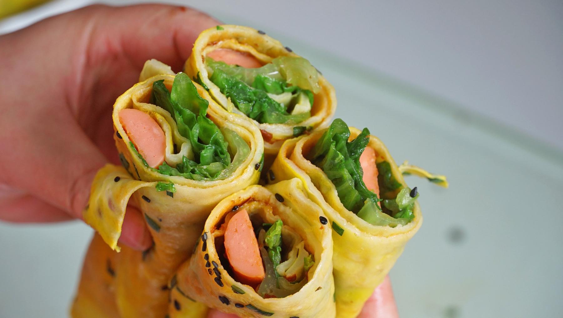 麪餅裏面我一般就是加的青菜和火腿腸,稍微的煎一下後再捲起來,喫起來會更香;