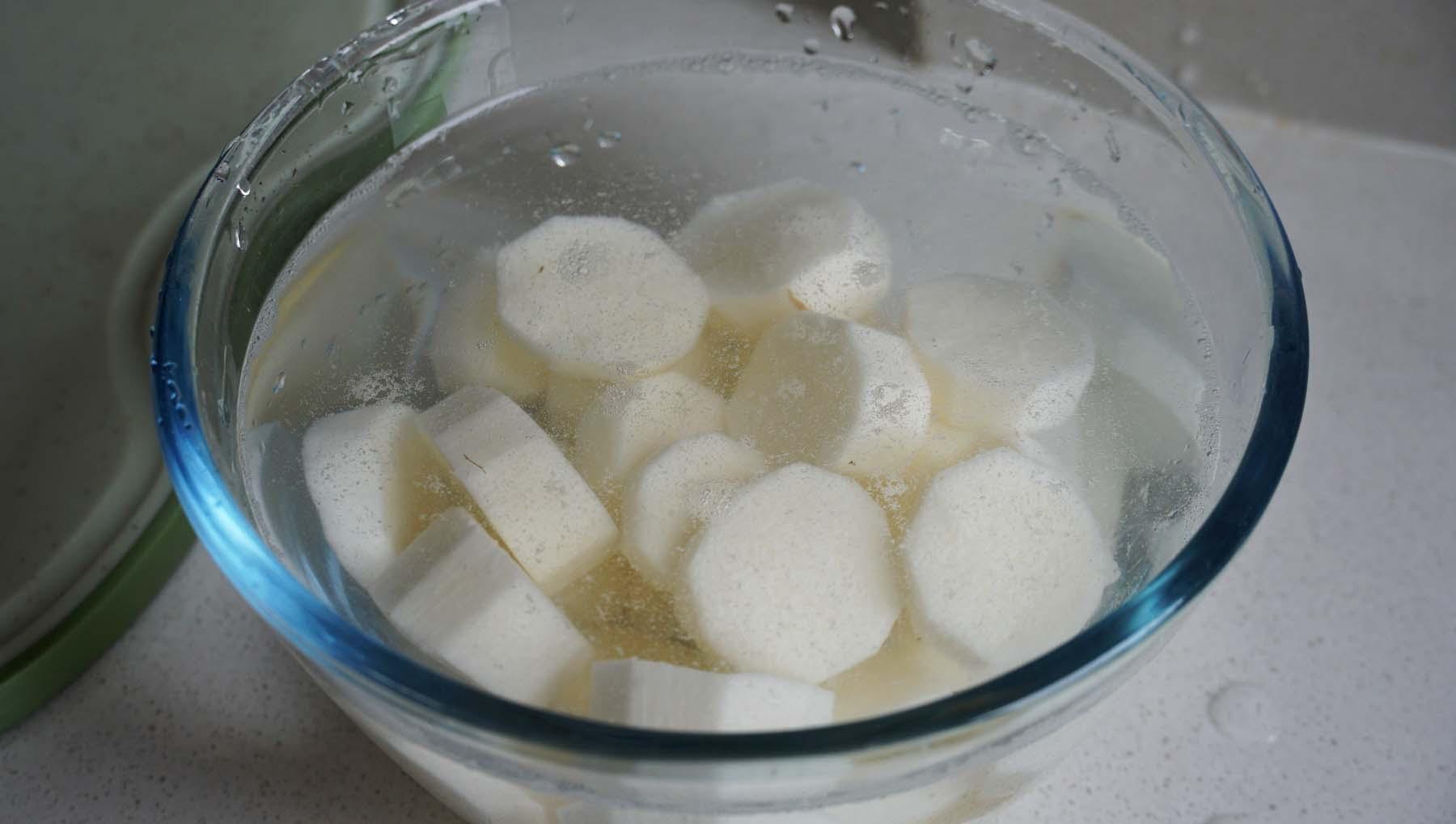 3、山藥記得戴上手套後再來削皮,切成小塊了就加水泡起來,避免氧化變黑;