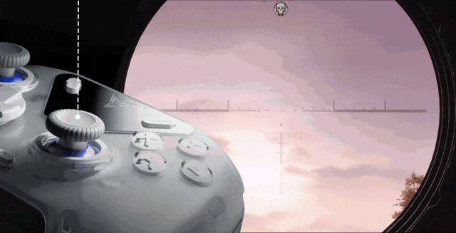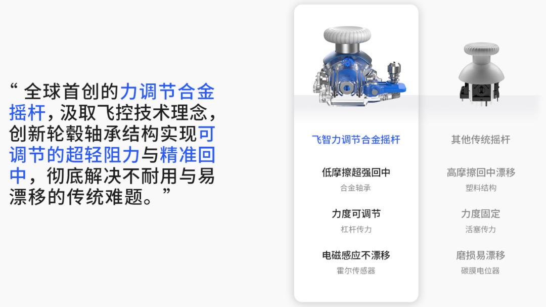 這一設計放棄了傳統手柄搖桿的“平面畫圓”的二維轉動方式,而是重新設計了搖桿的力傳動方式。飛智團隊發明了一種輪轂式合金軸承結構,極大地減少了轉動阻尼,同時通過精確的幾何運算與軟件排布計算出阻尼一致性的標準值,從而首創了全球第一款飛控級遊戲搖桿。